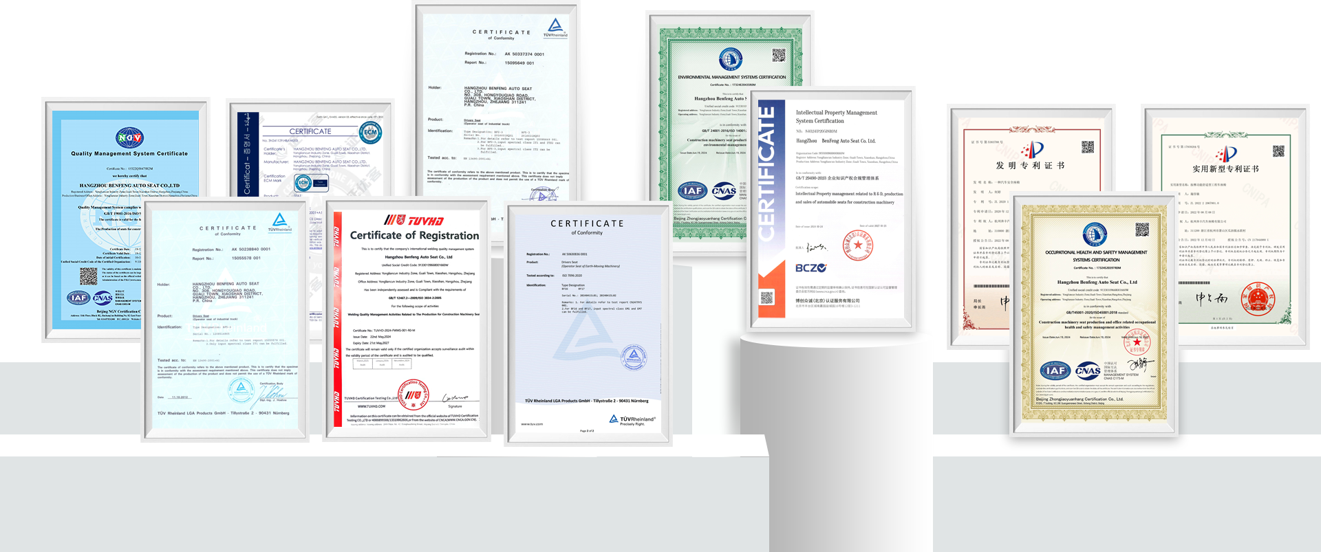 作为JB/T 13693-2019《工业车辆司机座椅》国家行业标准起草单位,杭州奔丰拥有14000㎡自有厂区,核心部件100%自主生产,品质满足杭叉、永恒力等品牌的严格要求。产品通过多项ISO认证及CE认证,部分符合EN13490、ISO7096标准,并融合多项国家专利,为座椅提供稳定可靠的核心支撑。